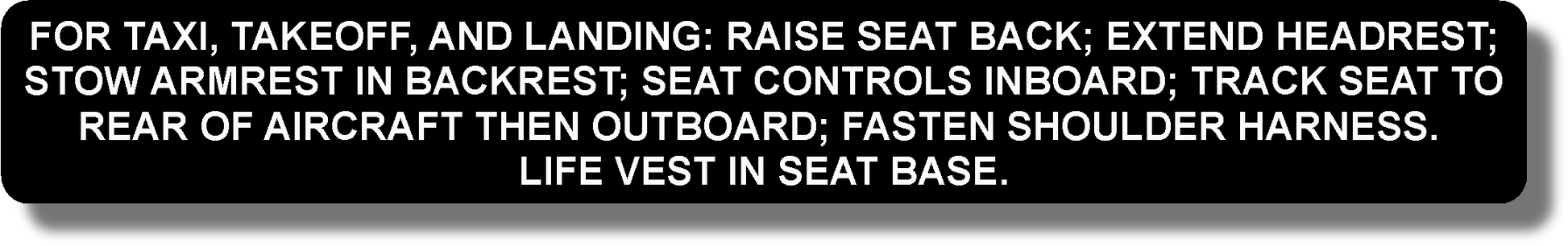 For Taxi, Takeoff, And Landing: Raise Seat Back; Extend Headrest; Stow Armrest In Backrest; Seat Controls Inboard; Track Seat To Rear Of Aircraft Then Outboard; Fasten Shoulder Harness. Life Vest In Seat Base.